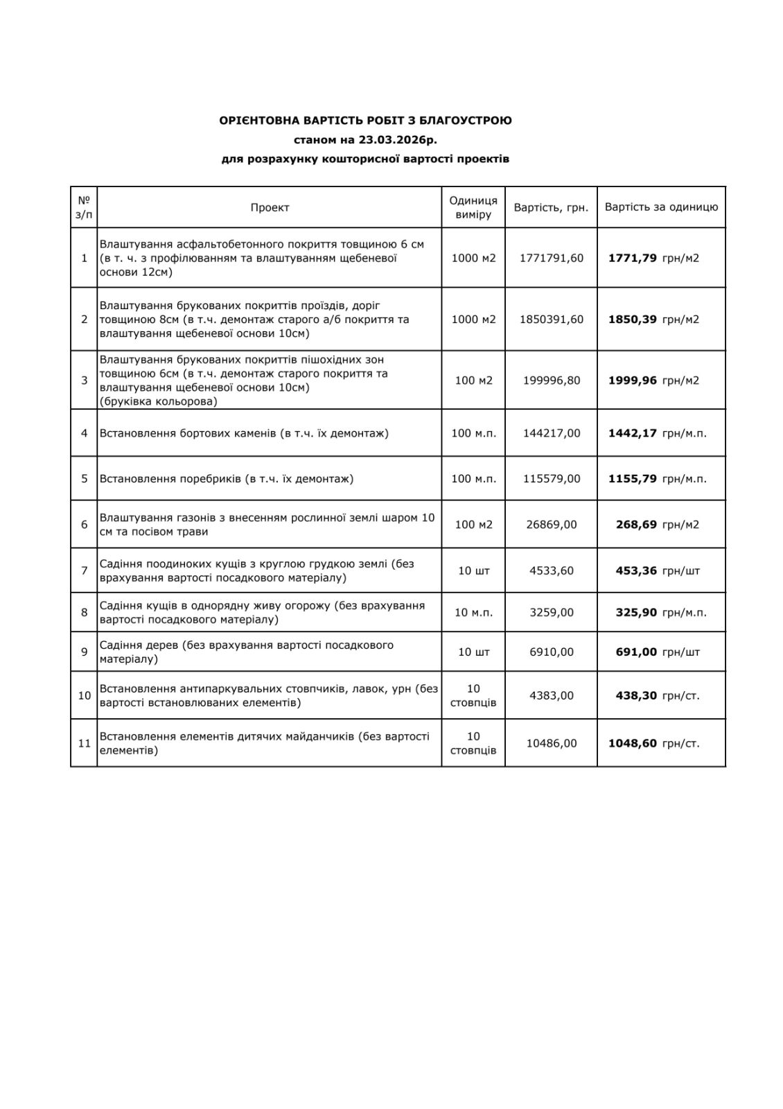 - Орієнтовна картість робіт у категорії "Благоустрій" Завантажити