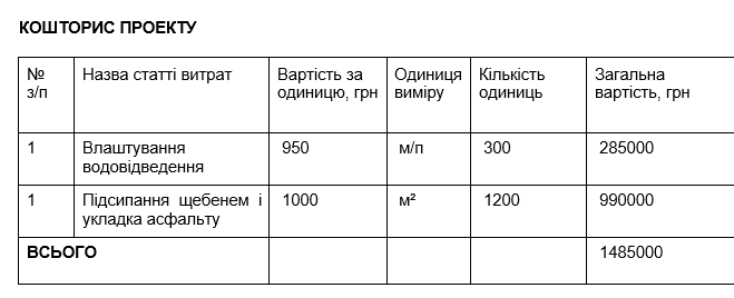 Реалізація даного проекту дасть змогу привести в якісний стан (асфальтування) дорожнє покриття однієї з невеличких вулиць села (1800 м²).